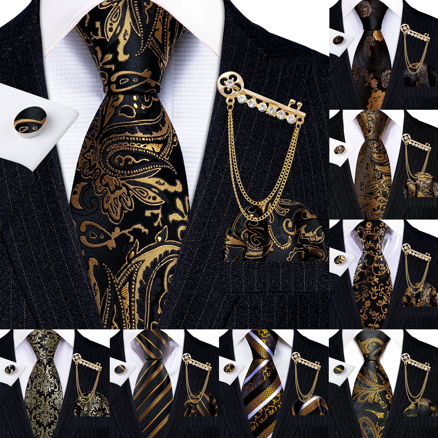 Barry.Wang Gold Black Jacquard Silk Mens Tie Hanky Cufflink Brooch Set Floral Paisley Necktie Pin For Male Wedding Business Gift