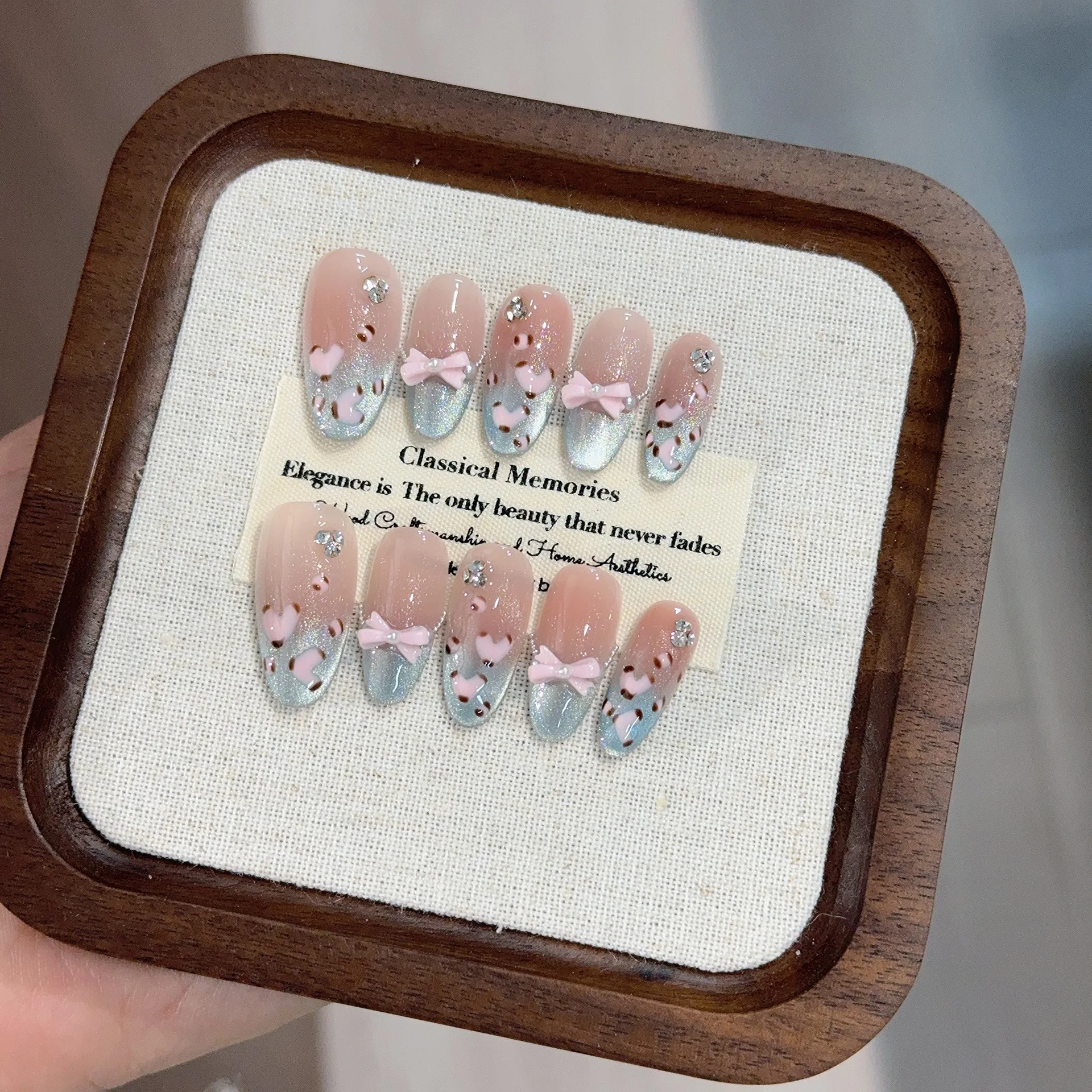 10Pcs Blue Cat's Eye French Nails Pink Bow Tie Removable Short Almond Nail Set with Love Leopard Print Wearable Sweet Fake Nails