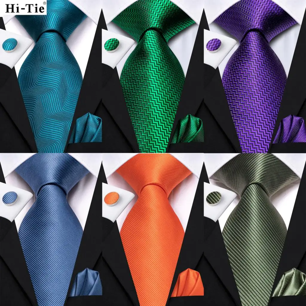 Hi-Tie Men Fashion Solid Green Blue Necktie Handkerchief Cufflinks Set for Tuxedo Accessory Classic Silk Luxury Tie for Man Gift  Read more