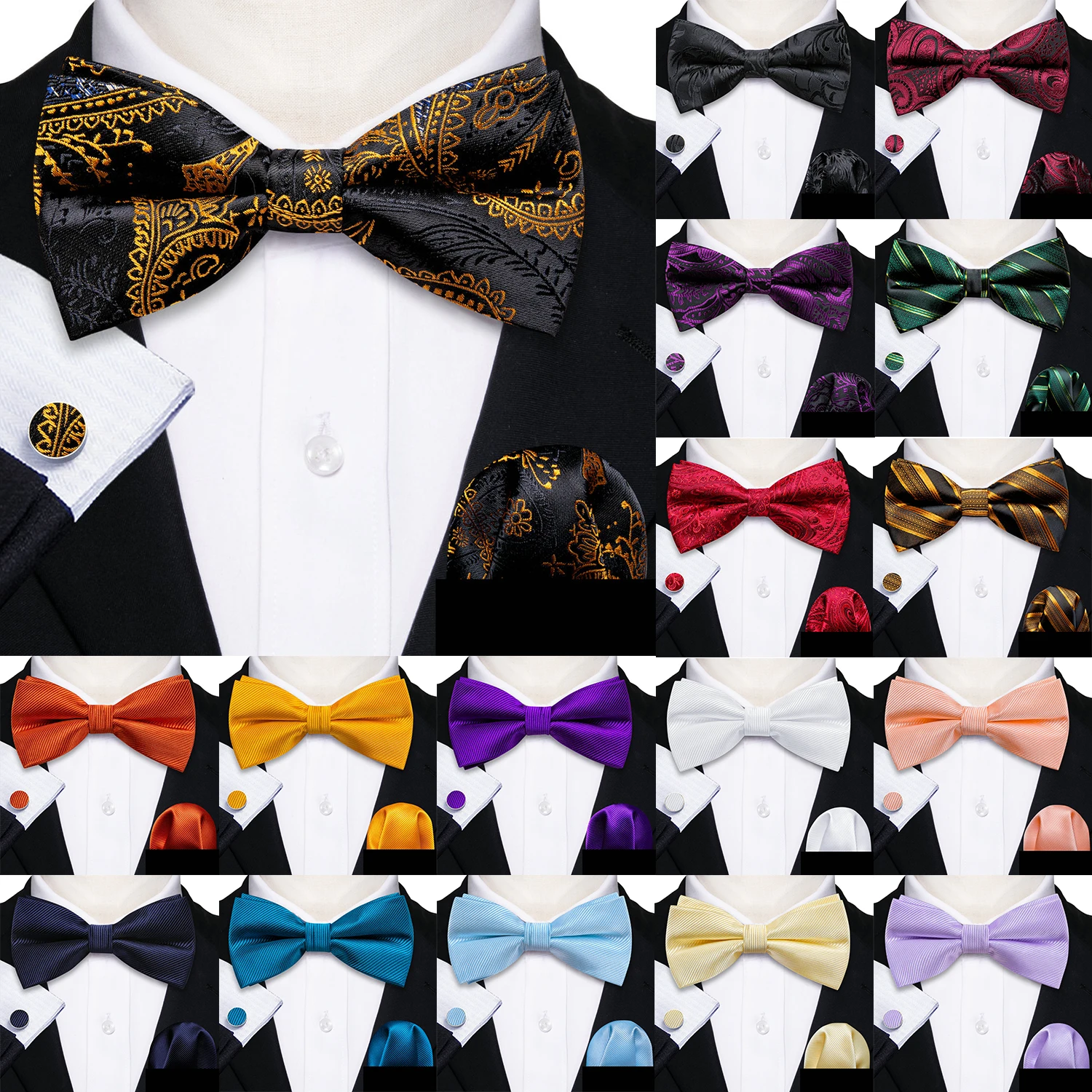 Barry.Wang Silk Mens Bow Tie Black Gold Blue Red Green Jacquard Paisley Floral Pre-Tied Bowtie Hanky Cuffs Set Wedding Business