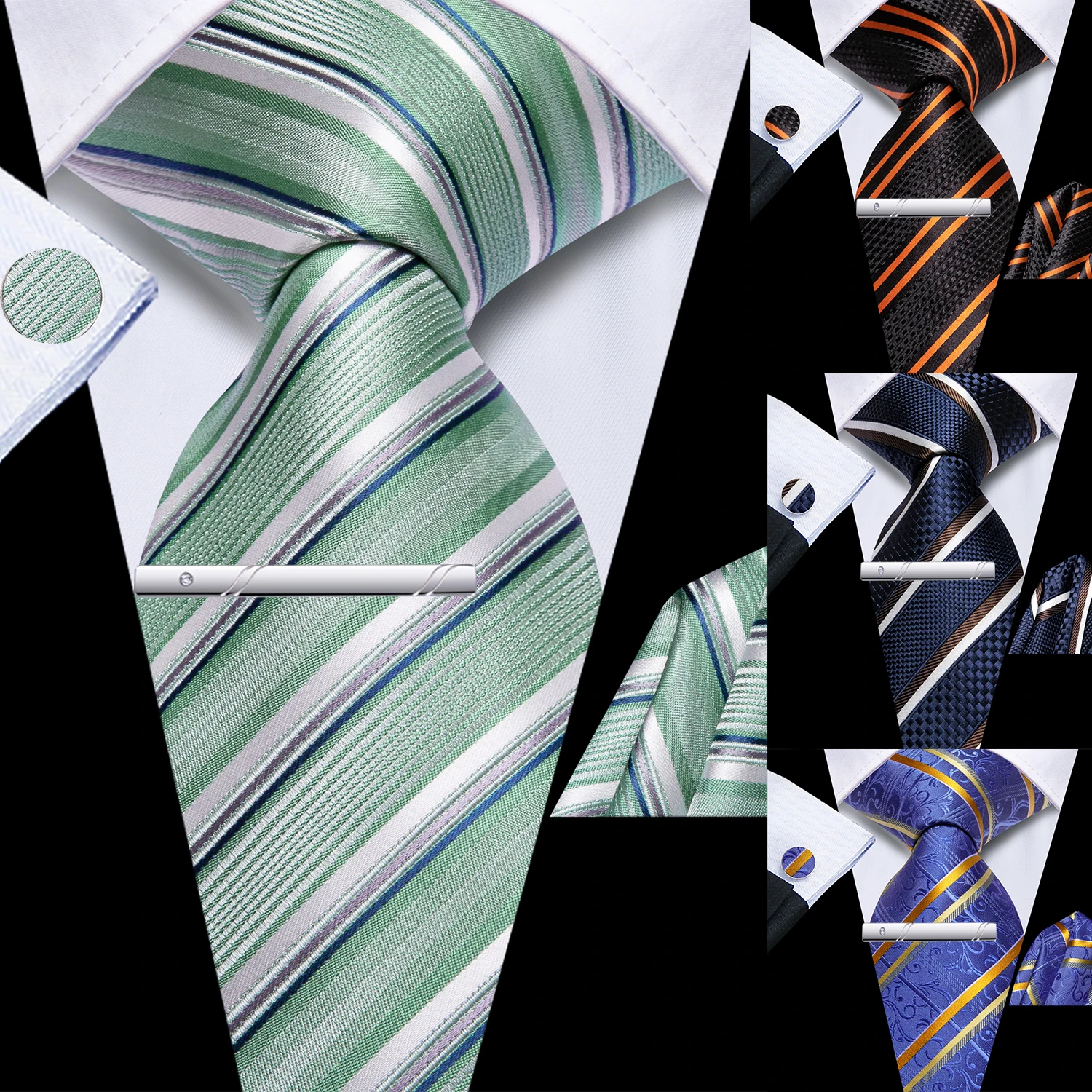 Hi-Tie Mens Tie Set Mint Green Blue Orange Purple Silk Wedding For Men Fashion Striped Quality Hanky Cufflink Dropshipping