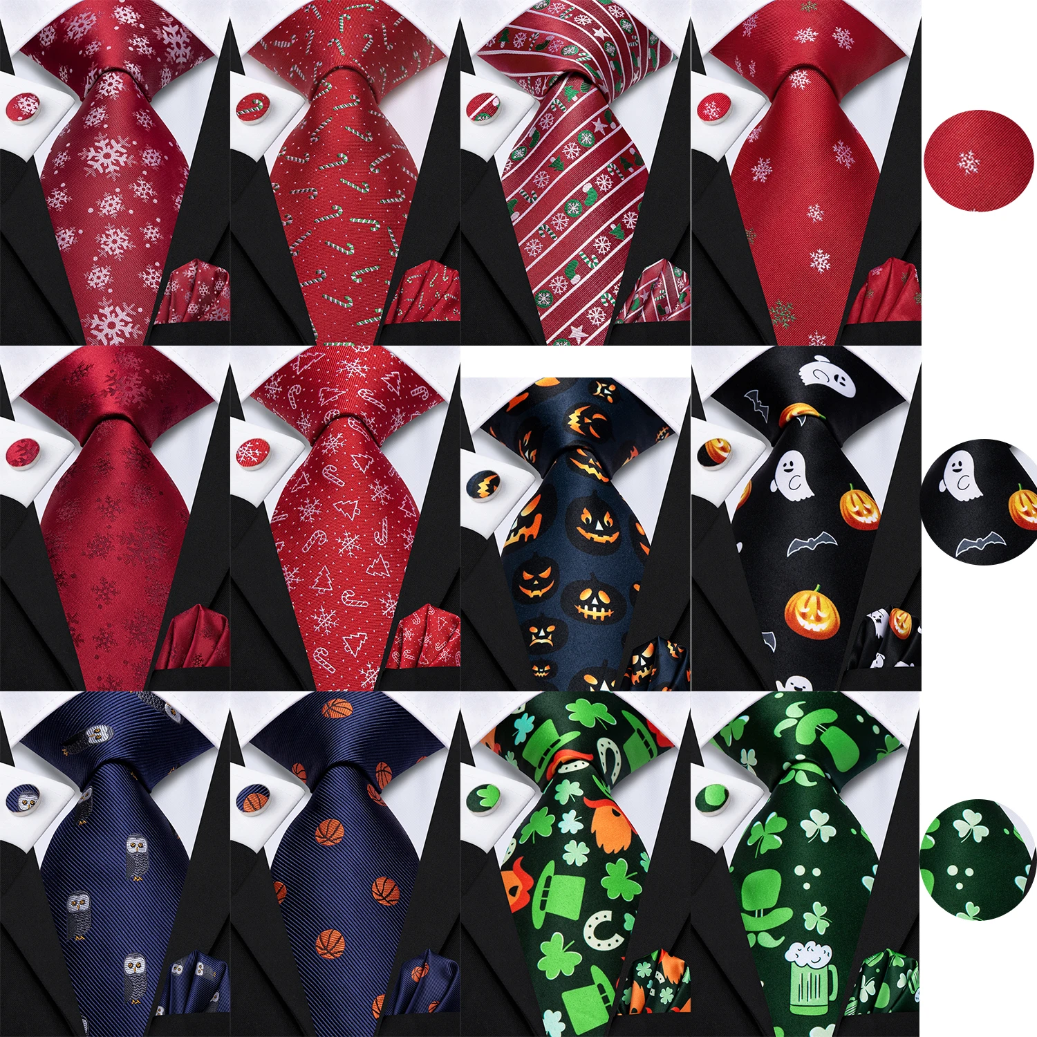 Hi-Tie Halloween Men's Tie Silk Red Green Blue 8.5cm Christmas Ties For Men Formal Hanky Cufflinks Set High Quality Cravata