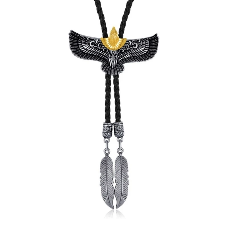 Mens Women American Bolo Tie Metal Cowboy Leather Rope Necktie Western Necklace with Feathered Pendant