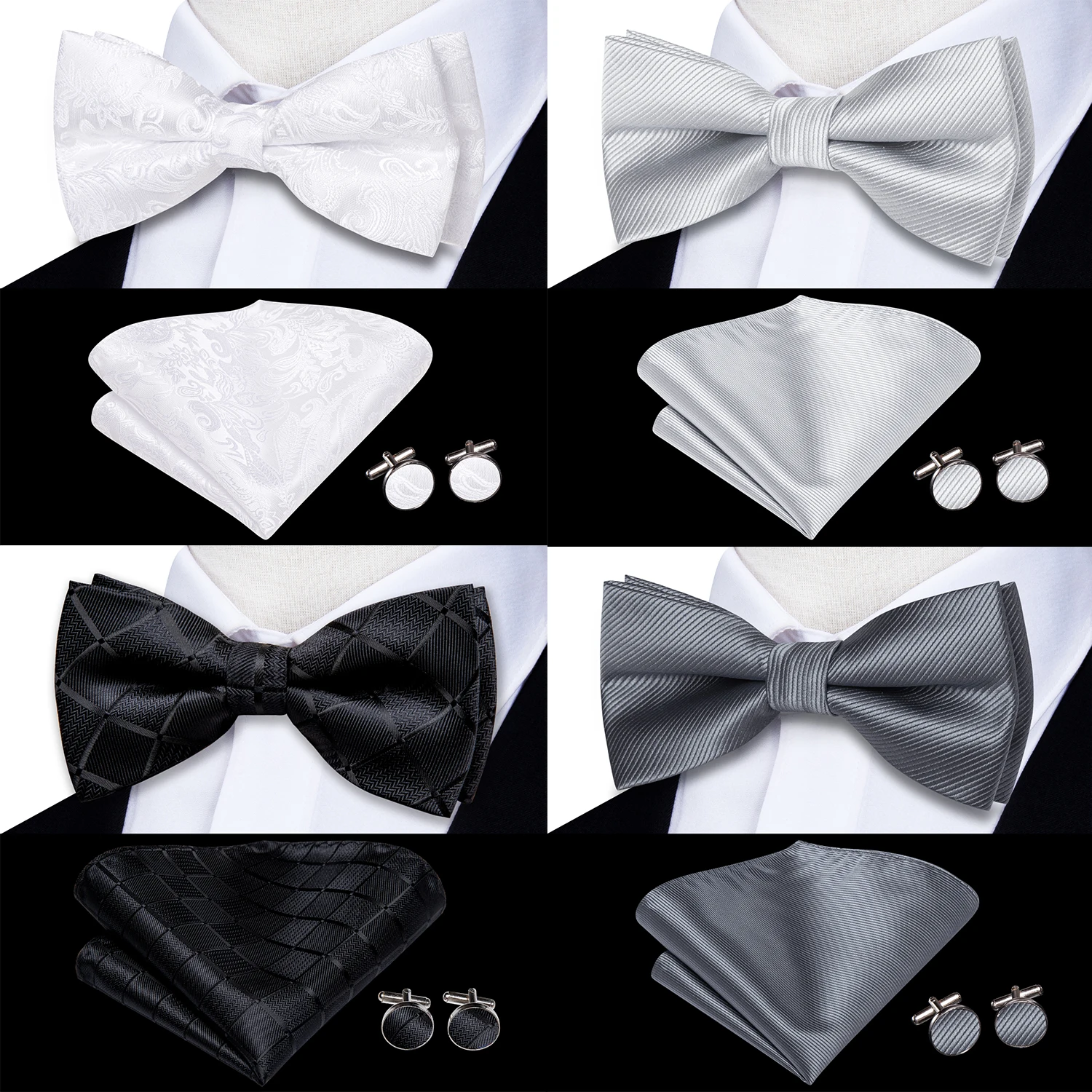 Hi-Tie Silk Mens Bow Tie Hanky Cufflinks Set White Black Gray Silver Pre-tied Butterfly Knot Bowtie for Male Wedding Business