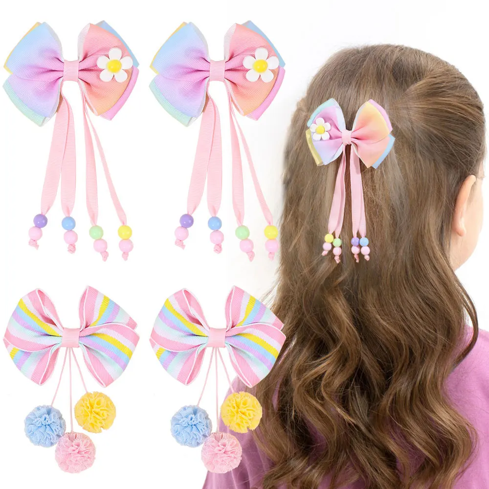 2PCS Sweet Ribbon Bow Hair Clips Elegant Bead Tassels Bowknot Hairpin Cute Pompon Barrettes Headwear Kids Hair Accessories