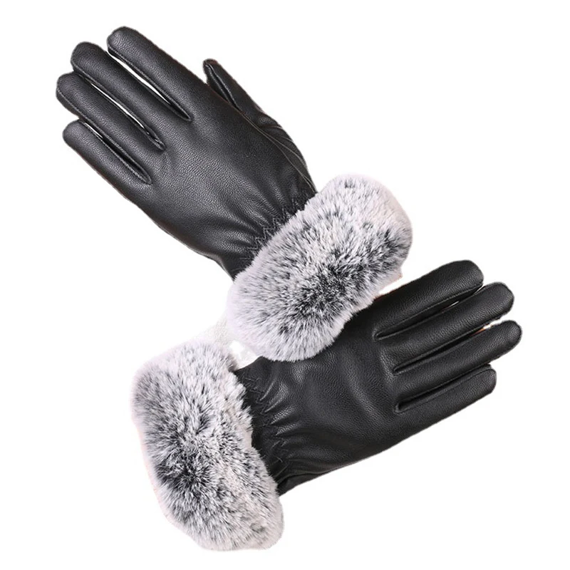 1 Pair Women Winter Warm Gloves Women Lady Black PU Leather Gloves Autumn Winter Warm Rabbit Fur Mittens Warmth Warmer Mittens