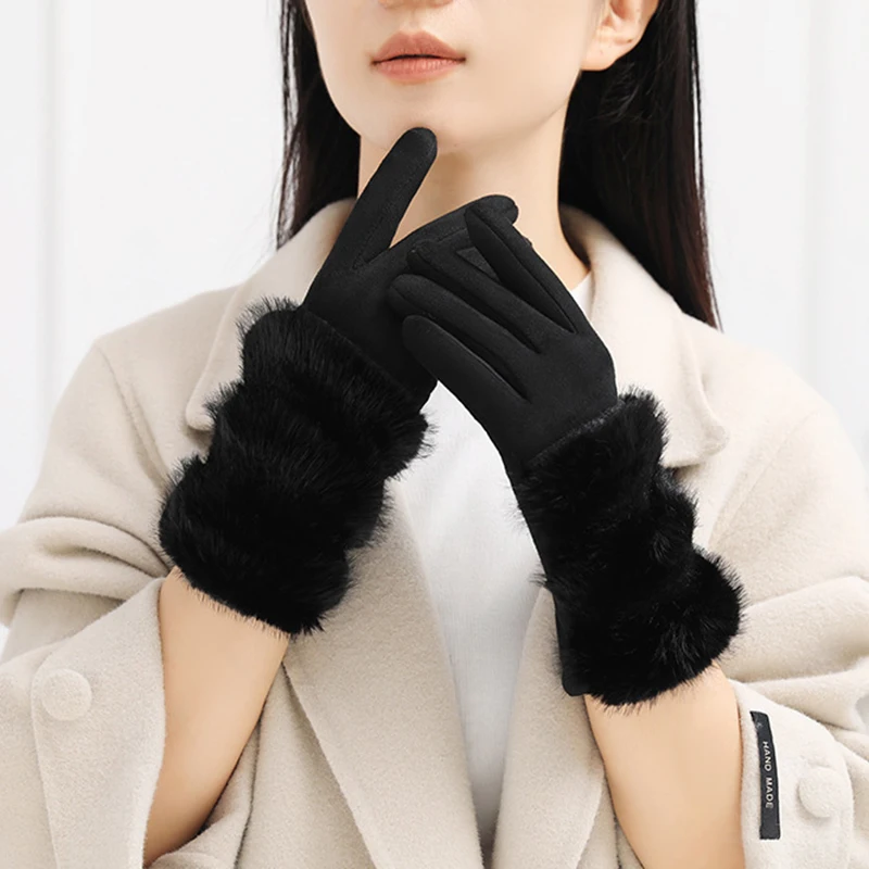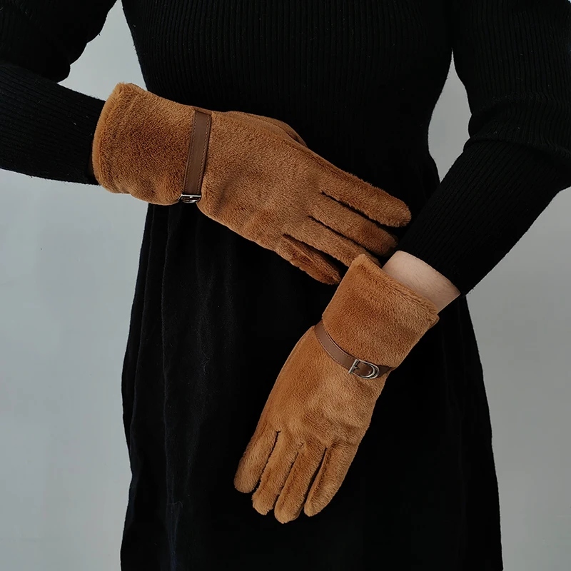Fashion Elegant Suede Touch Screen Keep Warm Winter Women Gloves Imitate Rabbit Fur Soft Windproof Leather Buckle Soft