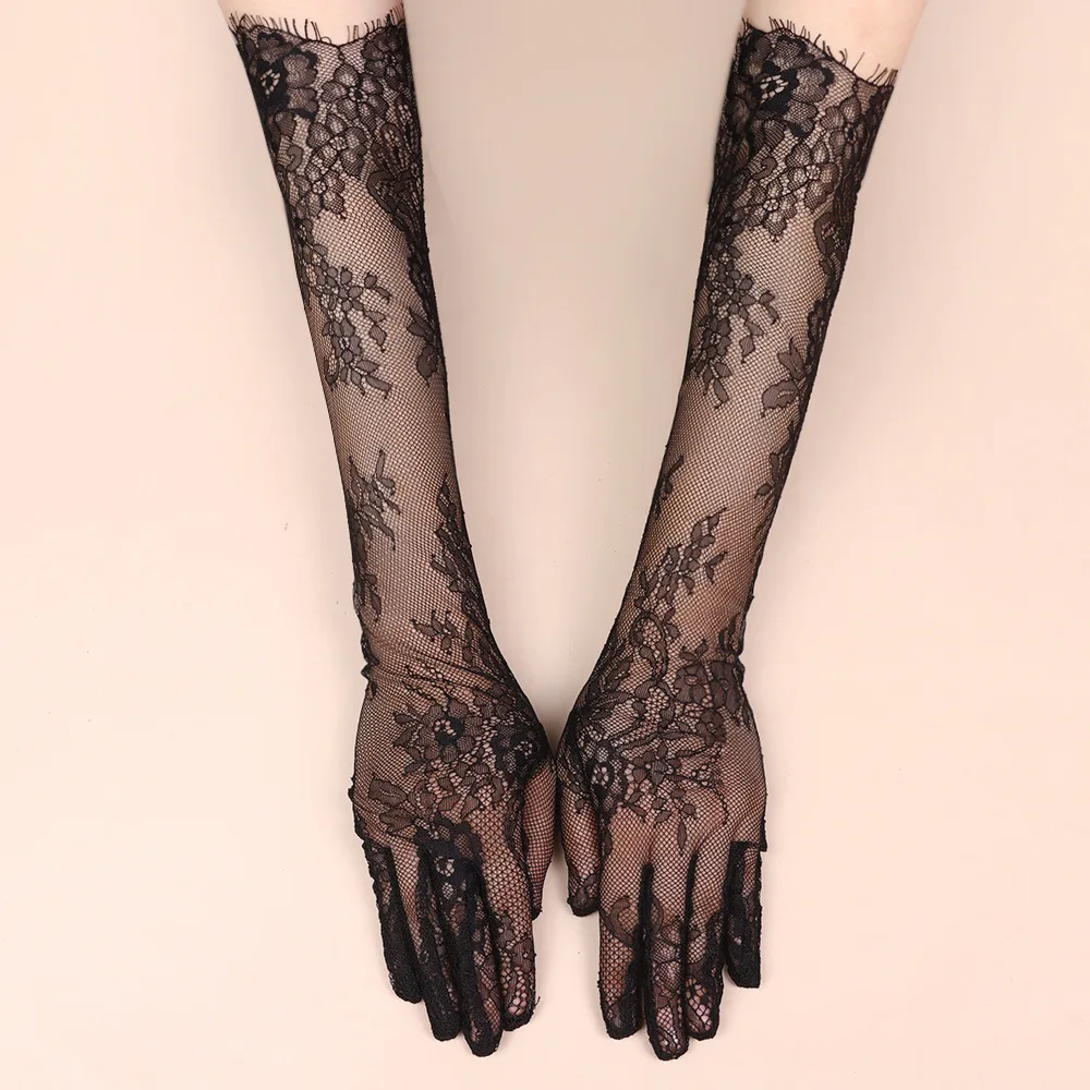 23cm 55cm 70cm Elbow Long Full Finger Women Black Lace Mesh Sheers Sexy Gloves Thin Hollow Transparent Wedding Bride Dress Mitte