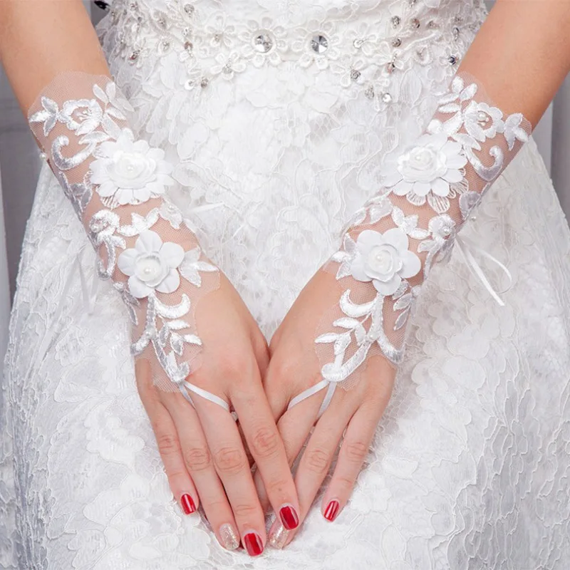 Lace Flowers Bride Wedding Gloves Pearl Fingerless Bridal Gloves Women Wedding Accessories