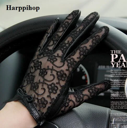 New Women Lace Genuine Leather Gloves Unlined Nappa Lambskin Wrist Sunscreen Glove 2018 winter fashion car motor lace mittens