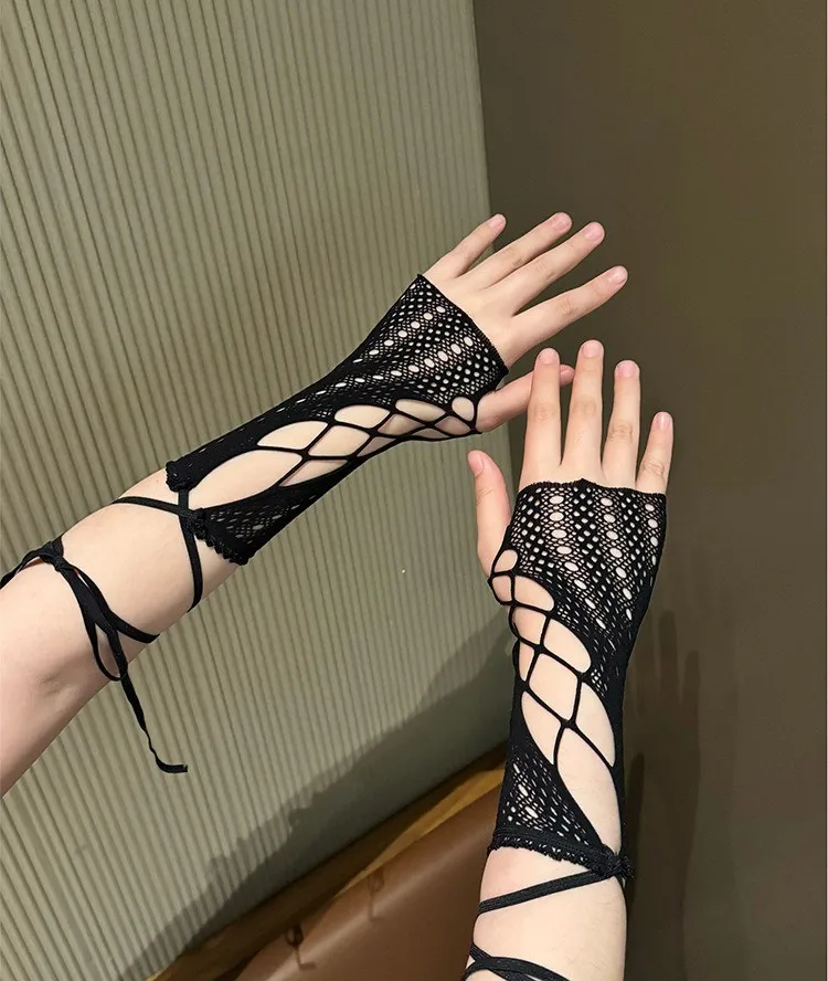 Lace cross tie sleeve gloves for women's fingerless fishing net gloves, summer sun protection party wedding gloves