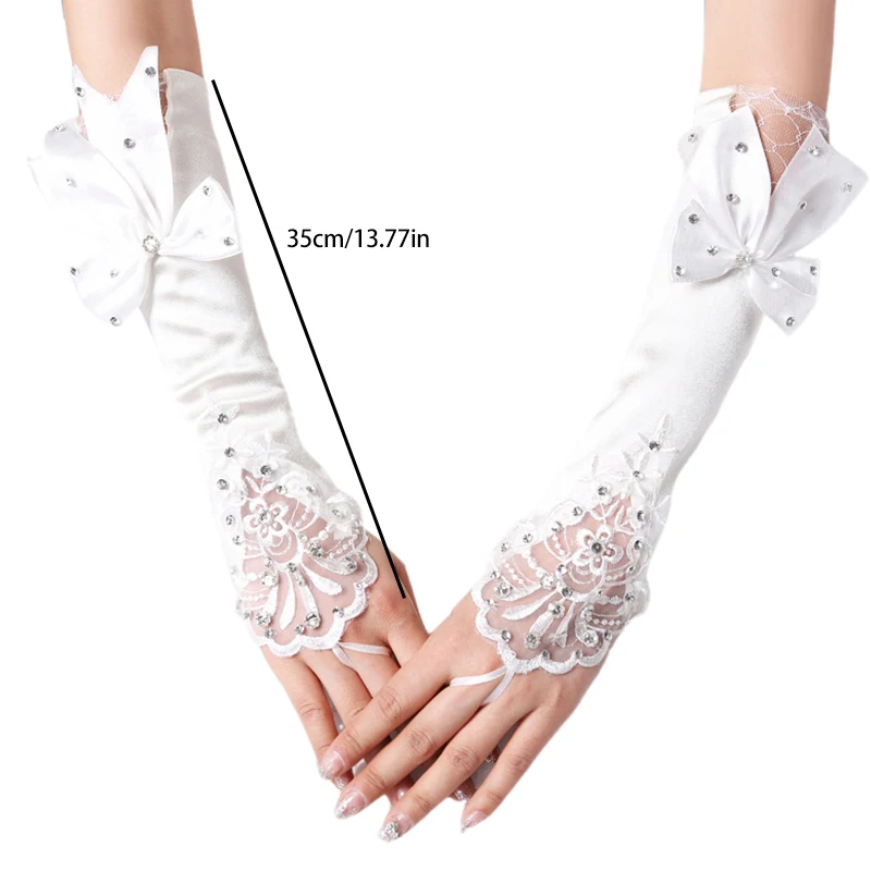 Satin Long Women’s Wedding Gloves Ivory Fingerless Lace Bridal Crystal Bow Flower for Bride Rhinestone Accessory
