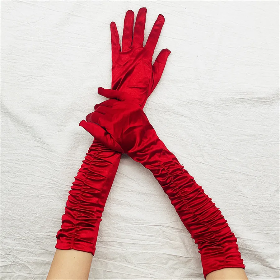 Women Long Solid folds Satin Soft Multicolor Ceremonial Gloves Dance Performance Elasticity Retro Style Opera