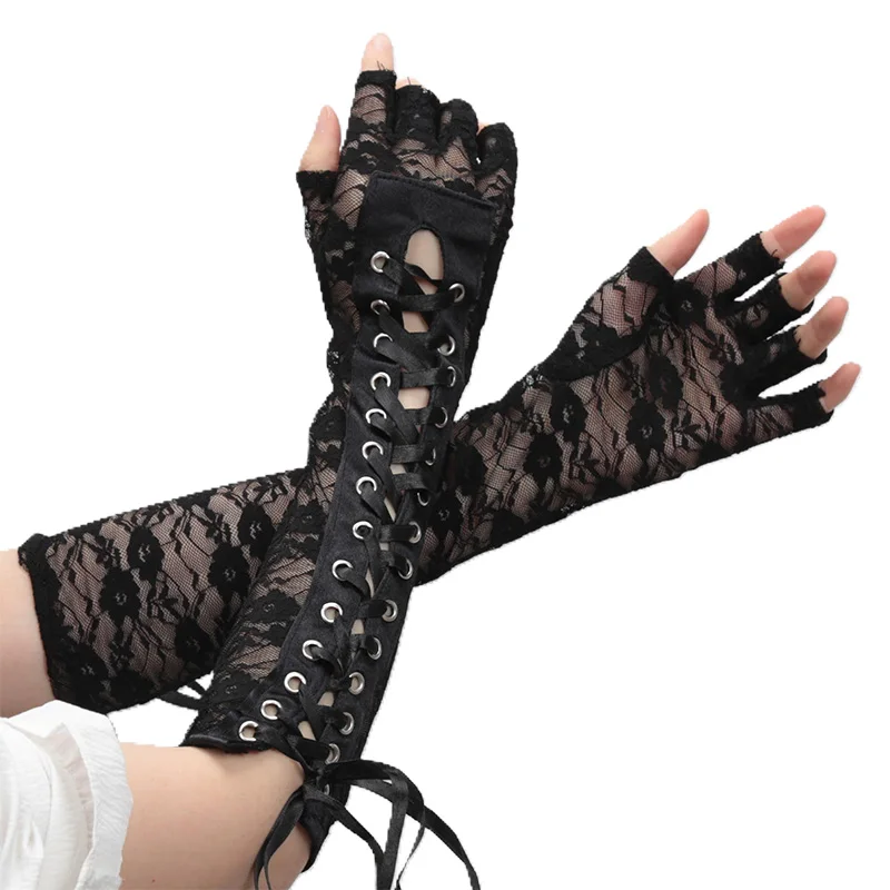 Women Sexy Floral Lace Length Half-Finger Gloves Goth Lolita String Ribbon Ties Up Dance Party Fingerless Fishnet Mesh Mittens