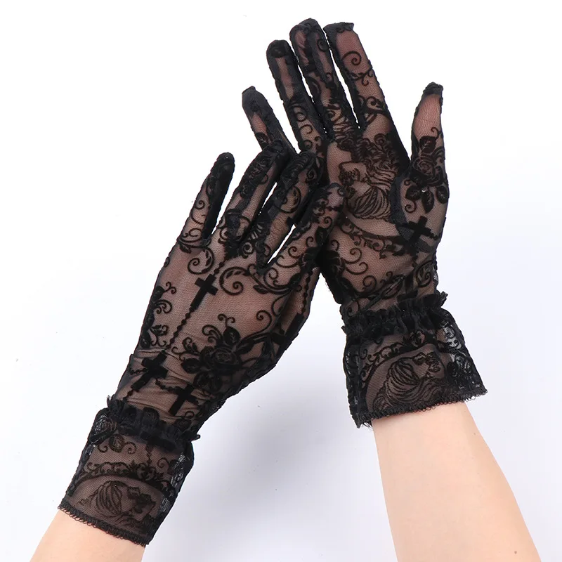 Punk Gothic Lolita Halloween Cosplay Rose Cross Black Lace Thin Gloves Halloween Women Sexy Transparent Elasticity Mesh Mittens
