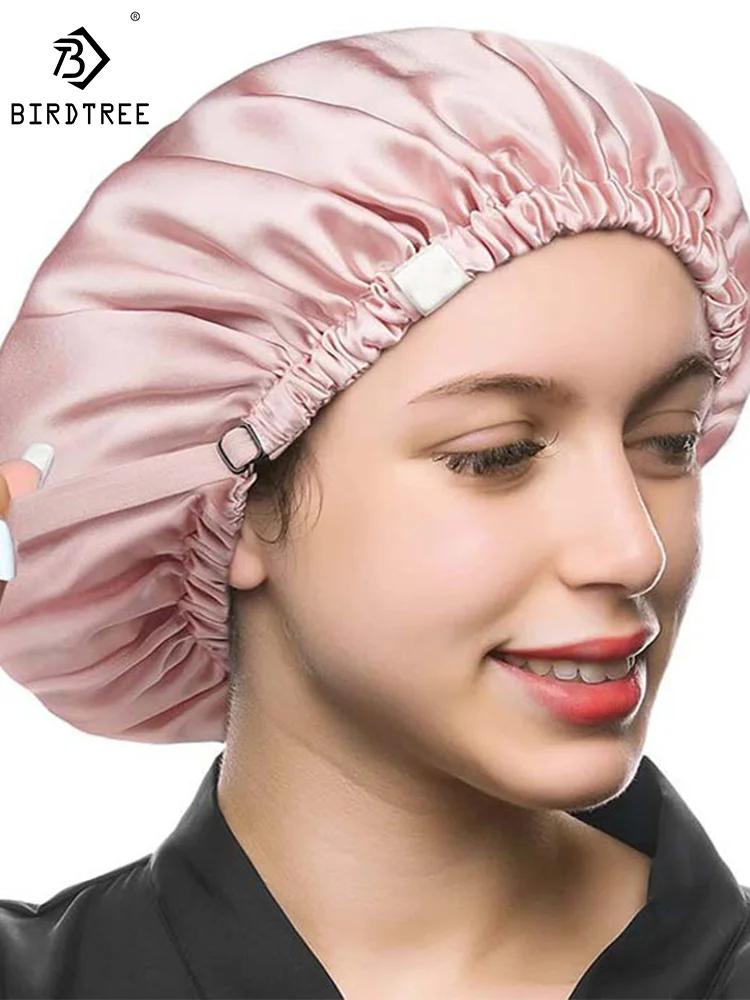 Birdtree 100% Mulberry Silk Bonnet Women Double Layer Sleeping Night Cap Pure Hair Wrap Elastic Headwrap A34324M