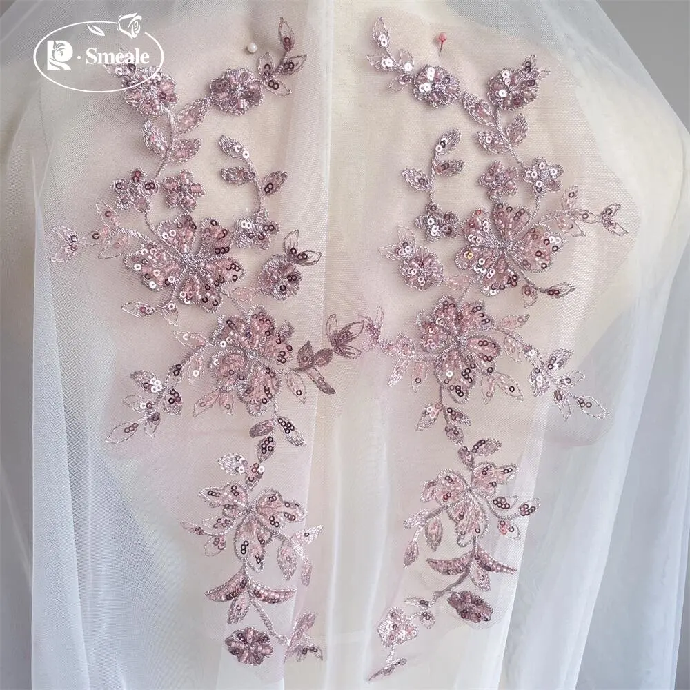 4pcs/2pair, 4 Colors, 32*14cm.Sequin Tube Bead Embroidery Lace Applique, Hanfu Headwear, DIY Lace Patch, Mirrored Flowers, RS4194
