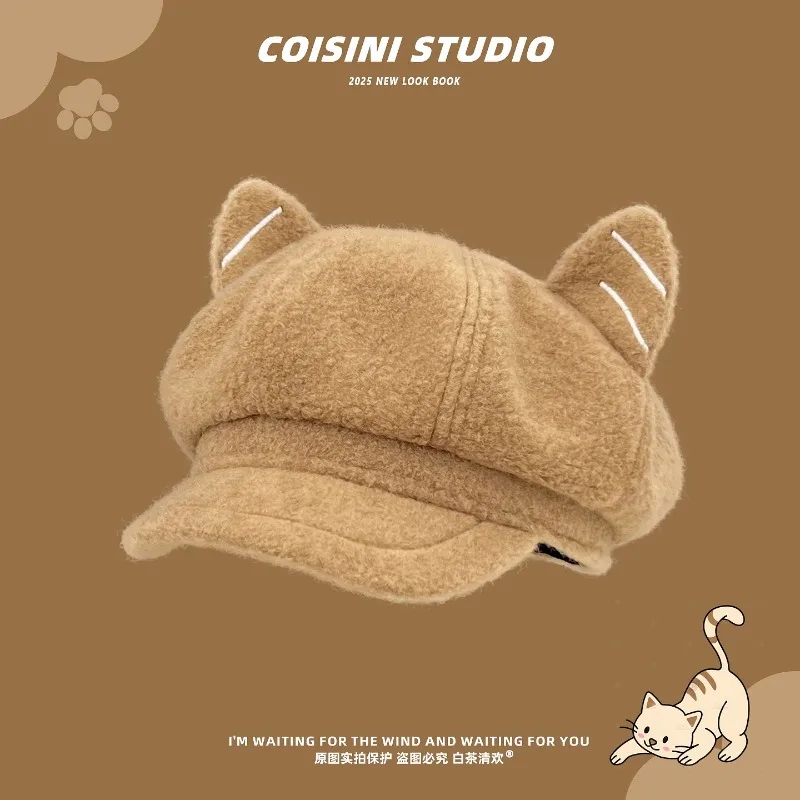 Japanese Cute Cat Ears Plush Berets Y2K Autumn Winter Warm Versatile Show Face Small Retro Newsboy Hats for Women and Men