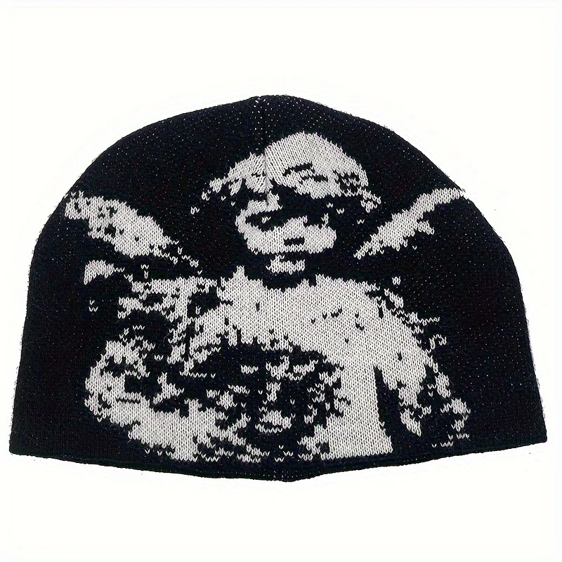 Angel Jacquard Beanie Black & White Edgeless Skull Cap Winter Hat for Women & Men Gothic Y2K Beanie for Everyday & Formal Events
