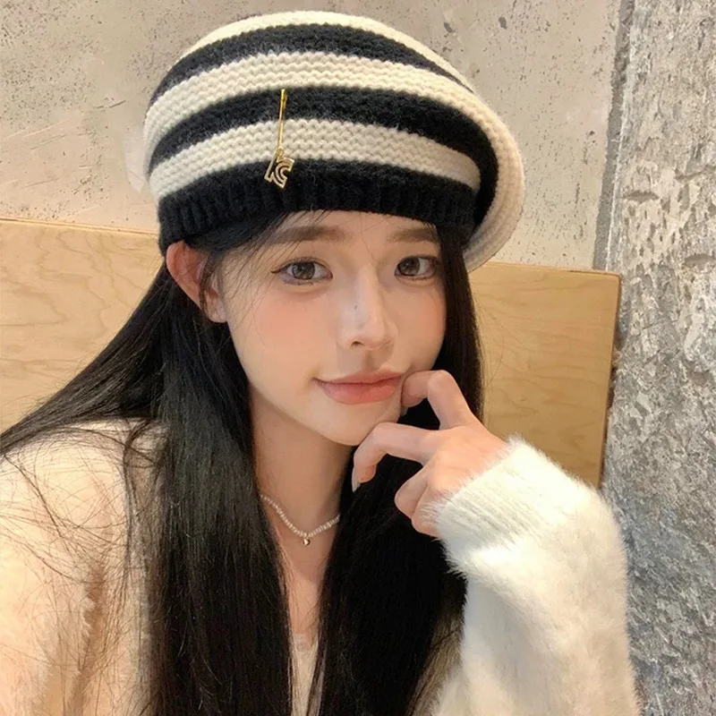 Korean Lazy Style Color Matching Striped Knitted Berets for Women Autumn Travel Casual Versatile Retro Literary Painter Hat