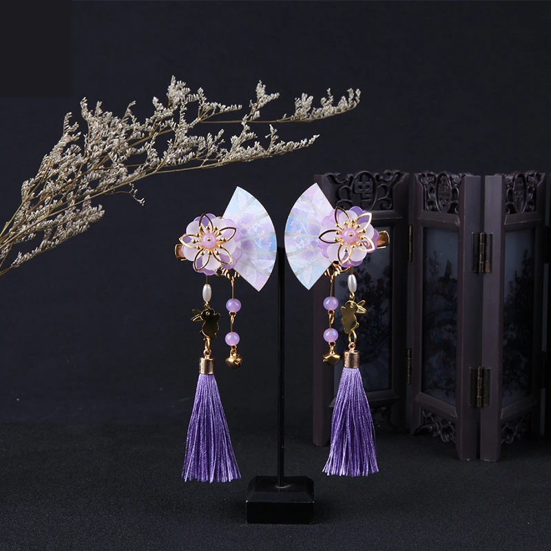 Game Impact Raiden Shogun Japanese Style Tassel Bead Hairpin Handmade Kimono Cos Flower Fan-shaped Hair Clip Prop Accessories
