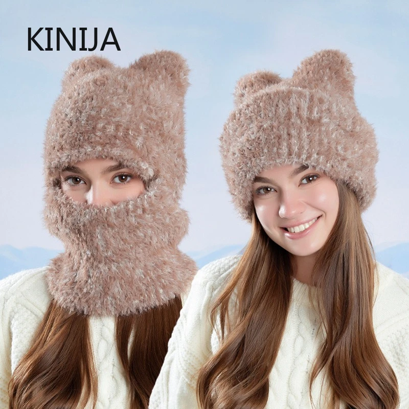 Winter Knitted Hat Ear Protection Balaclava Hat Fluffy Mask Neck Integrated Hooded Cap Outdoor Thickened Hat for Ski Cycling  Read more
