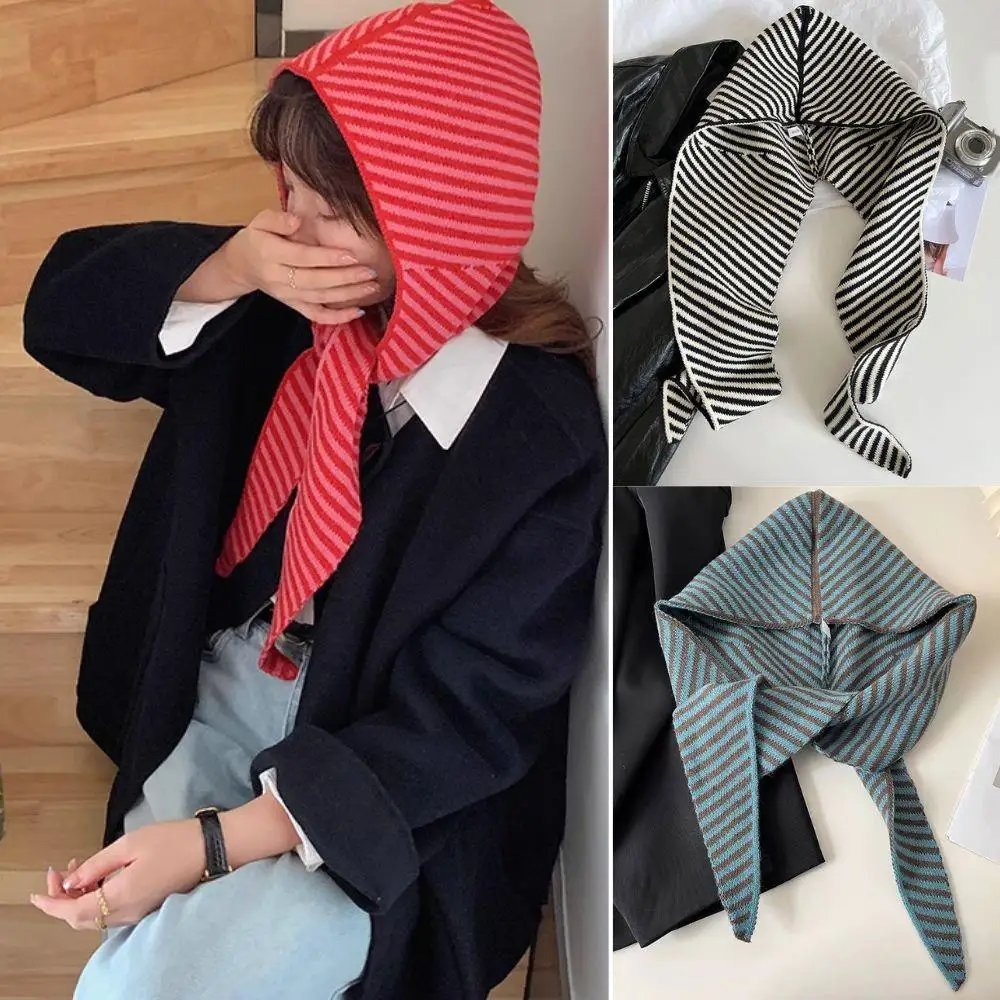 New Korean Striped Hood Scarf Balaclava Hat Ear Protection Warm Bomber Hats Women Retro Wool Knitted Beanies Winter Accessories