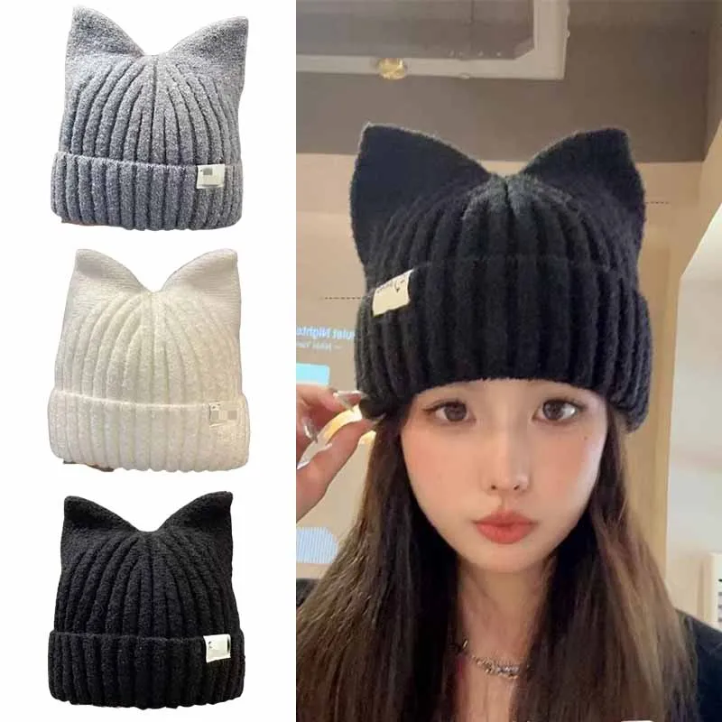 Cute Cat Ear Beanie Women Winter Knit Hat Japanese Kawaii Style Soft Warm Cap With Ears For Girls Daily Wear Fashion Streetwear