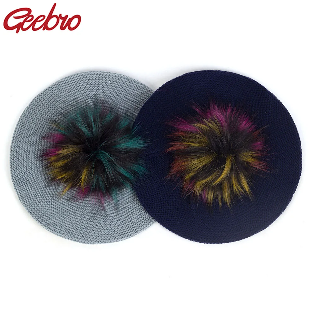 Geebro Slouchy Fashion Knitted Beret For Women Acrylic Hats Faux Fur Pom Pom Casual Bonnet Caps Female Solid Artist Baggy Beret