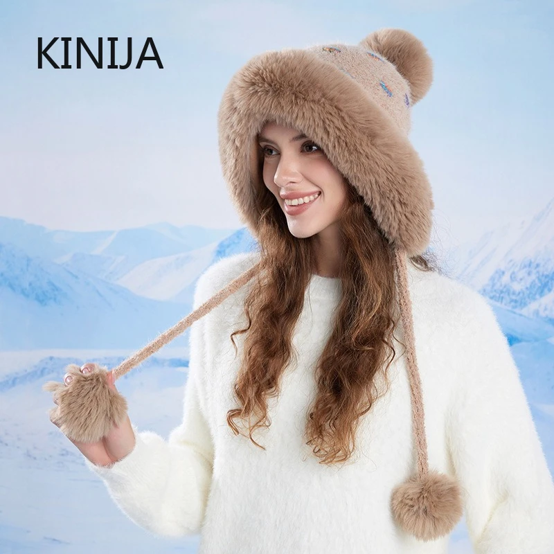 Winter Fluffy Fur Kintted Cap for Women Russian Lady Soft Warm Ear Protection Hats Female Outdoor Plush Coldproof Ball Beanies