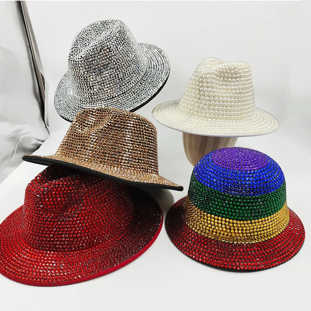 Rhinestone and Pearl Fedoras Jazz Hats for Men and Women Red Matching Black Diamond Fedoras Stage Banquet Cap 2022 wholesale