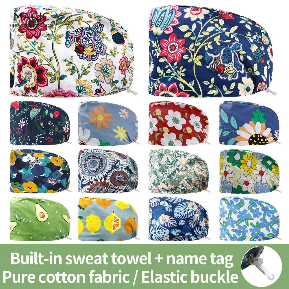 100% Cotton Scrub Hats Nurse Print Medical Scrubs Satin Lined Doctor Surgical Cap Pet Vet Dentist Work Hat with Adjusting Buckle