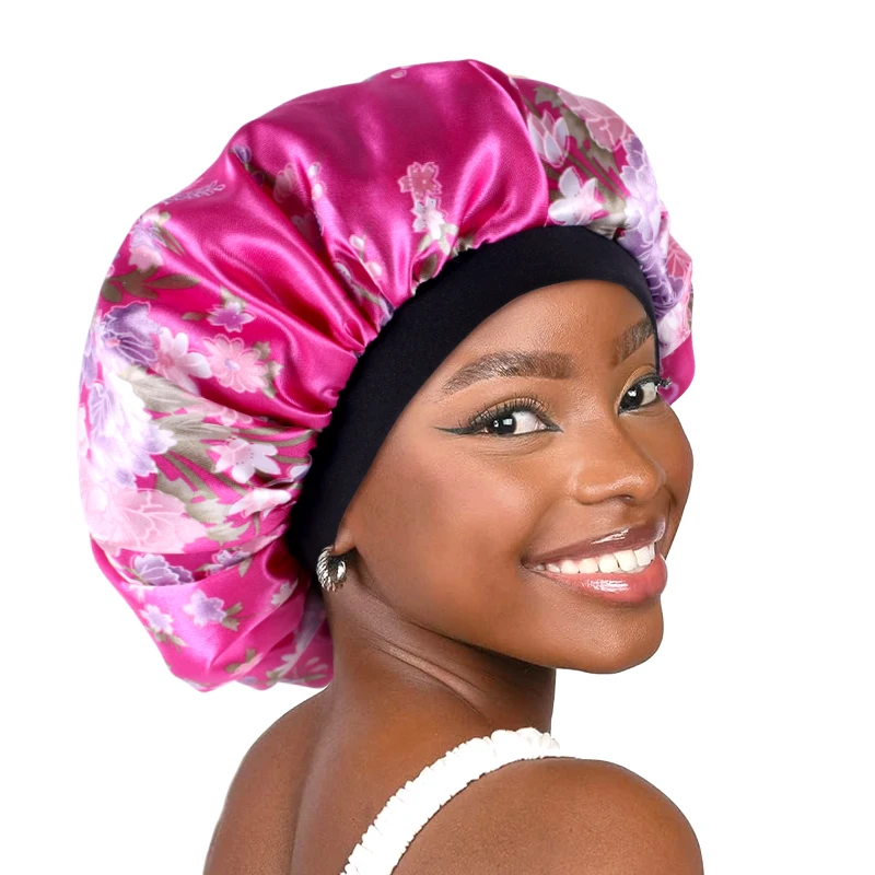 Women Satin Bonnet Elastic Wide Band Floral Printing Night Sleep Hat Hair Loss Head Wrap Chemo Hair Care Shower Makeup Cap