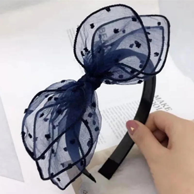 Navy Blue Mesh Bow Hairband Toothed for Women Romantic Dots Headband Bow Adults Solid Headband Women Korean Lace Bow Head Band