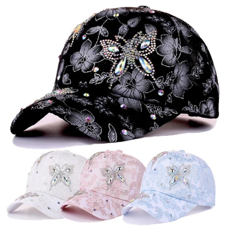 Women Baseball Cap Flower Butterfly Rhinestone Lace Breathable Sunshade Curved Brim Fashion Cap Street Dance Party Casual New