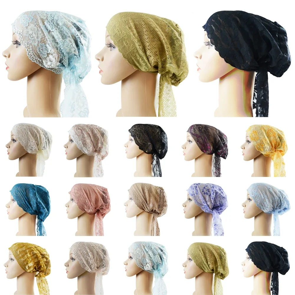 Women Muslim Inner Lace Cap Hijab Arab Lace Islamic Headwear Turban Hat Wraps Arab Flower Lace Turban Bonnet Hat Ramadan Fashion