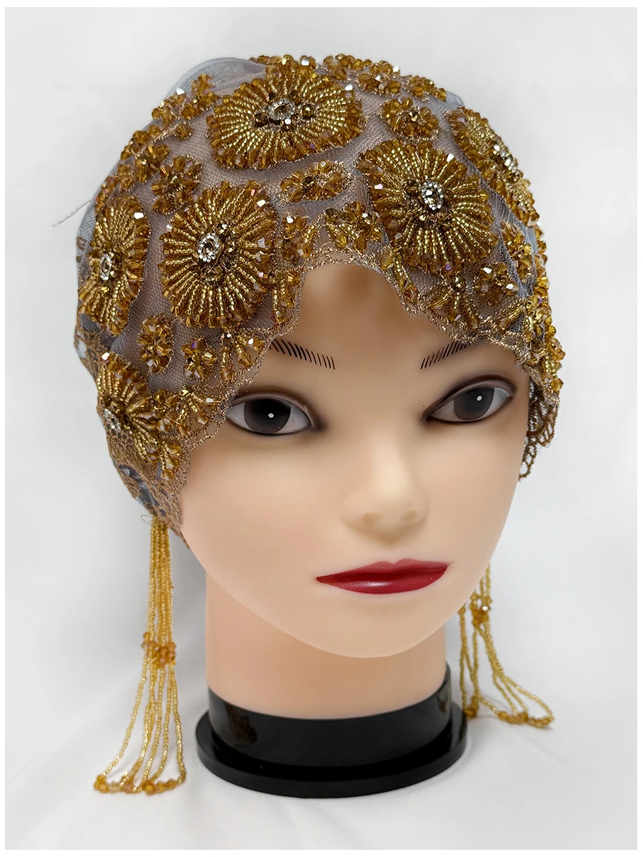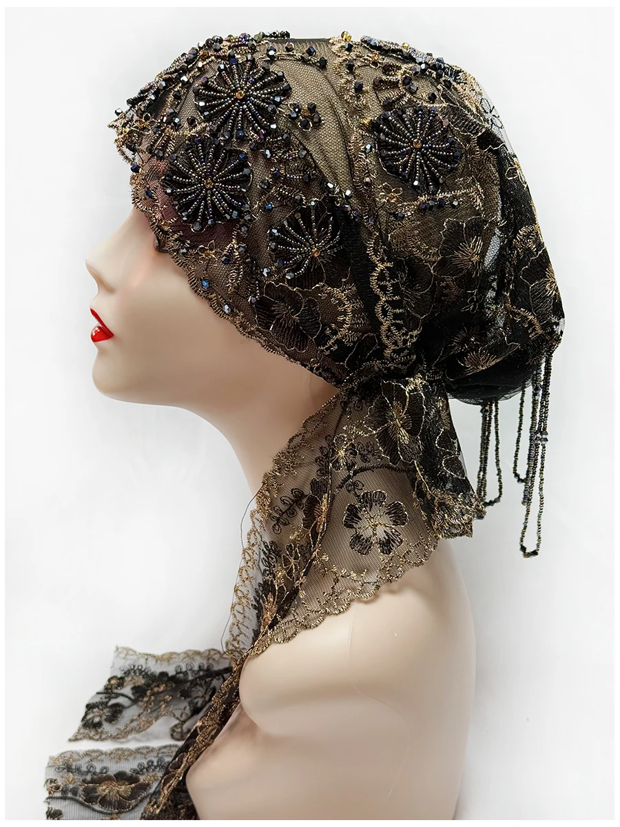 Muslim Lace Pearls Hat Caps Mesh Fabric Bead Tube Paired With An Acrylic Diamond Thread Embroidered Hat For Dubai Arabian Women