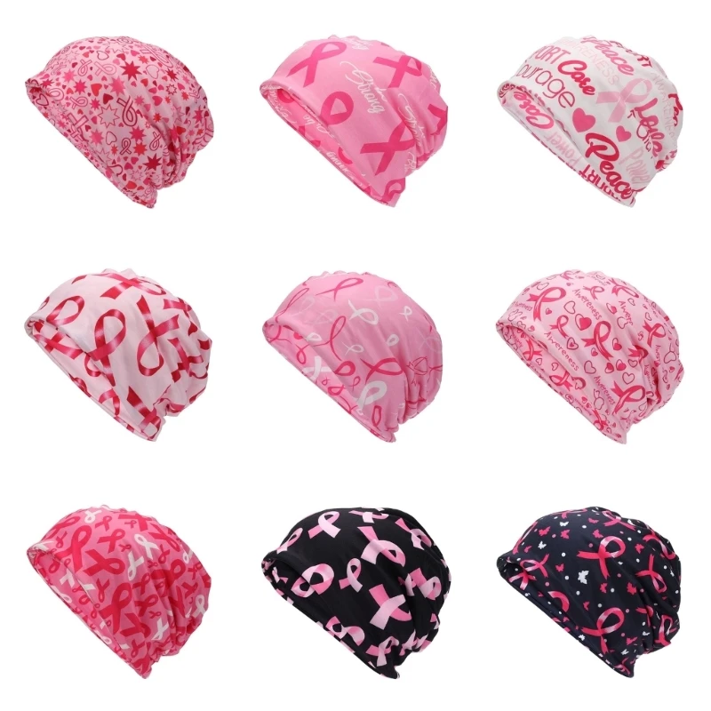 Breast Cancers Awareness Elastic Skull Hat Ribbon Printed Pattern Caps for Women