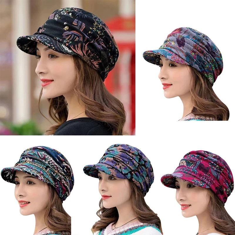 2025 New Women Peaked Cap Short Brim Warm Foldable Earflap Women Cap Ethnic Style Floral Print Autumn Winter Hat Daily Clothing
