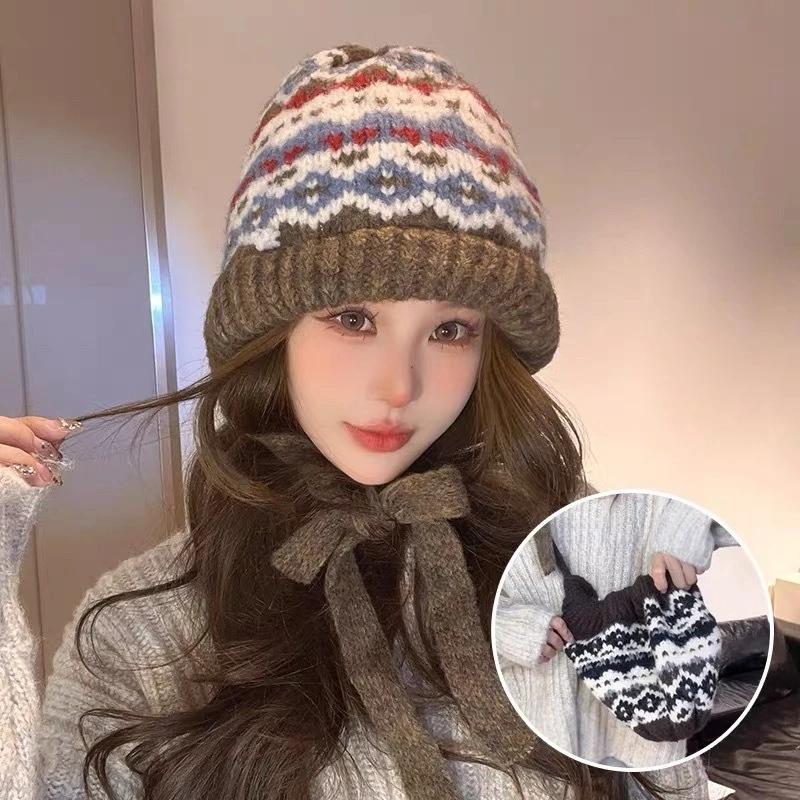 1pc Autumn Winter Bowknot Contrast Striped Polka Dot Crochet Headhat, Thick Striped Knit Fisherman Bucket Hat for Women Christmas