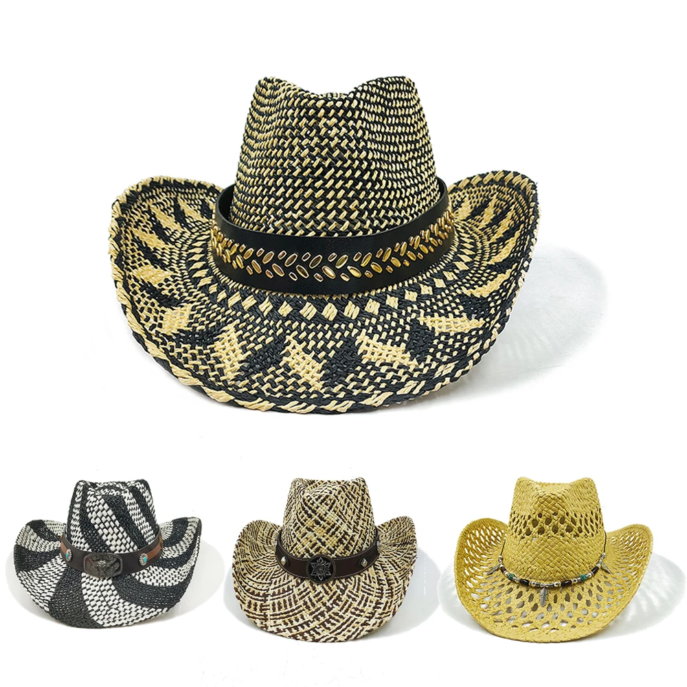 Summer Outdoor Men Women Hand-woven Western Cowboy Paper Straw Hats Wide Brim Breathable Beach Multicolor Cap 2024 New