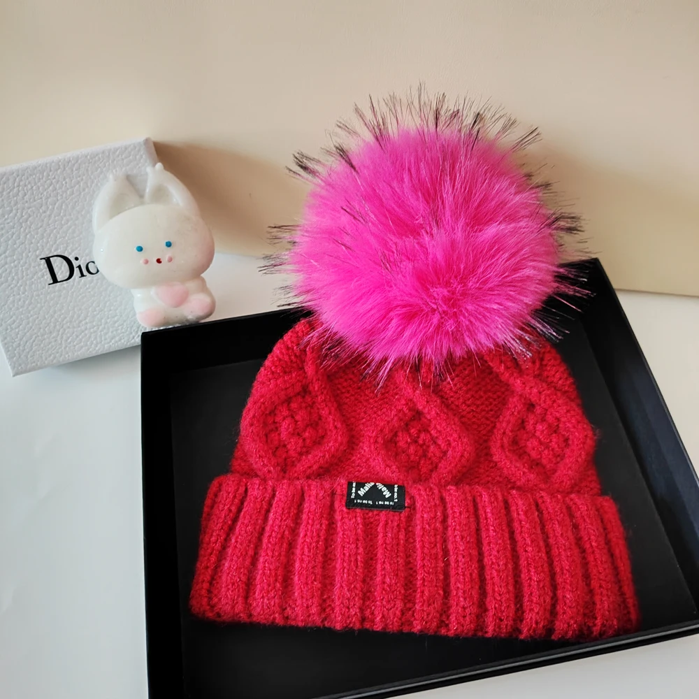 2025 new women's wool hat paired with candy colored artificial fox fur ball winter fashion hat twisted pattern hat  Read more