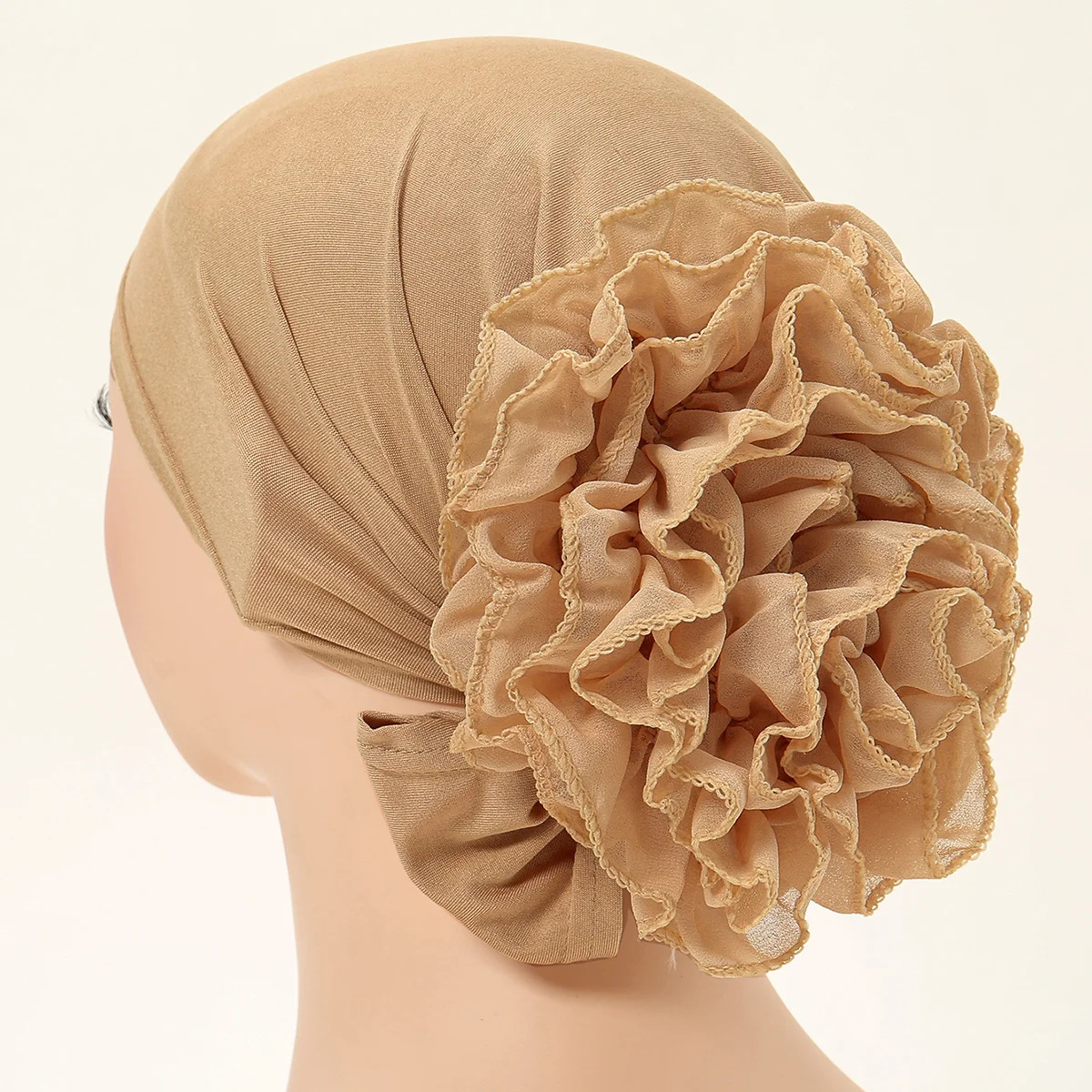 Muslim Women's Hijabs with Lace Chiffon Panhua Solid Color Thin Bottom Hat Islam Head Wrapping Tie Back Turban Female Headband