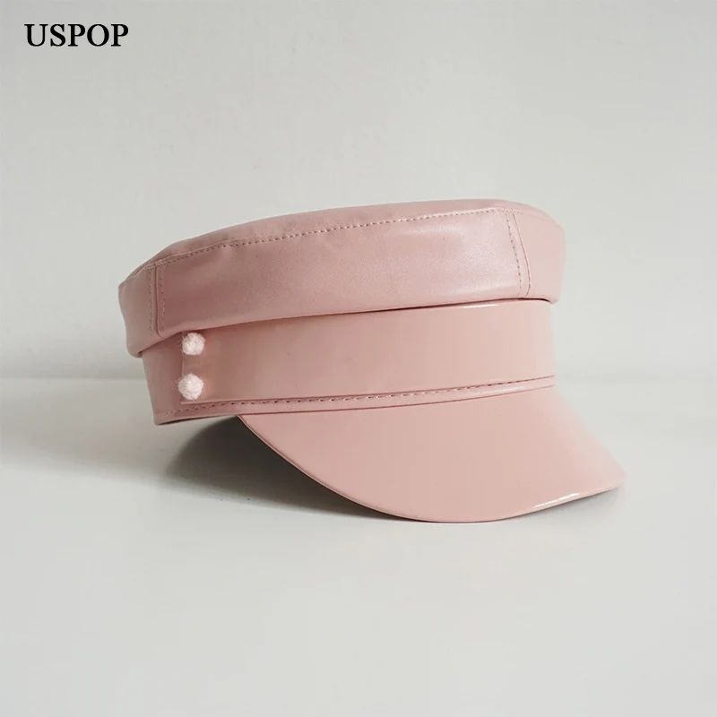 USPOP New Leather PU Newsboy caps Women Flat Visor Cap Solid Color Militray caps S M L
