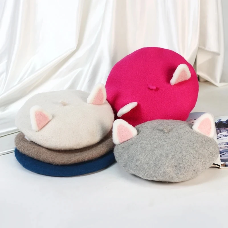New Cute Cat Ear Solid Color Wool Winter Beret Female Autumn Warm Hat Women Girl Casual Cap Handmade Gift Wholesale Dropshipping