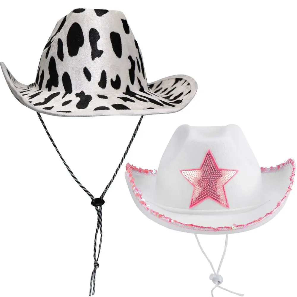 Pink Star White Cowgirl Hat Sequin Trim Fringe Cow Girl Hat Adjustable Cowboy Hat Neck Draw String Costume Party Play Dress-Up