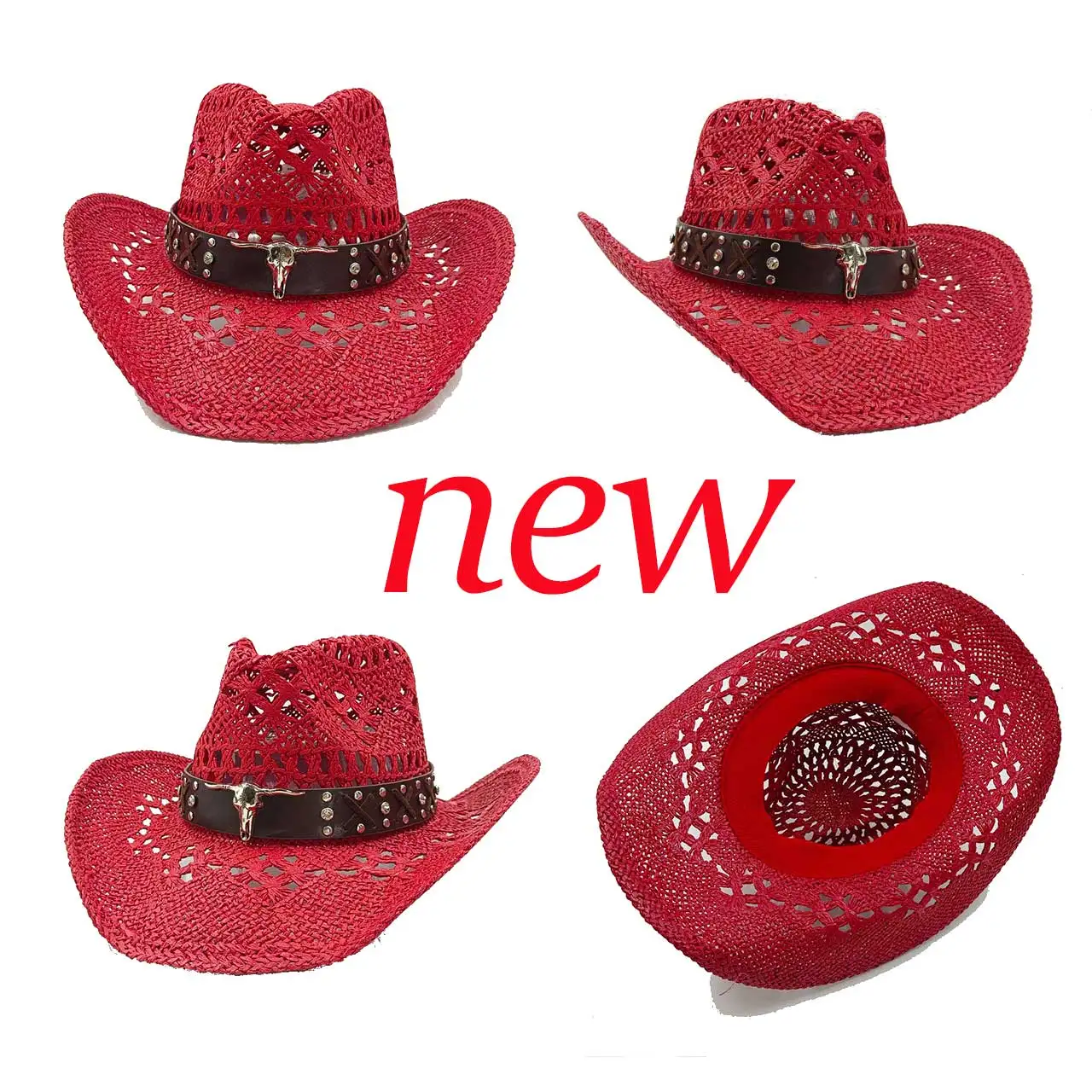 Cowboy straw hat red hollow summer sun protection beach sun hat men and women cowboy hat sombrero cowboy