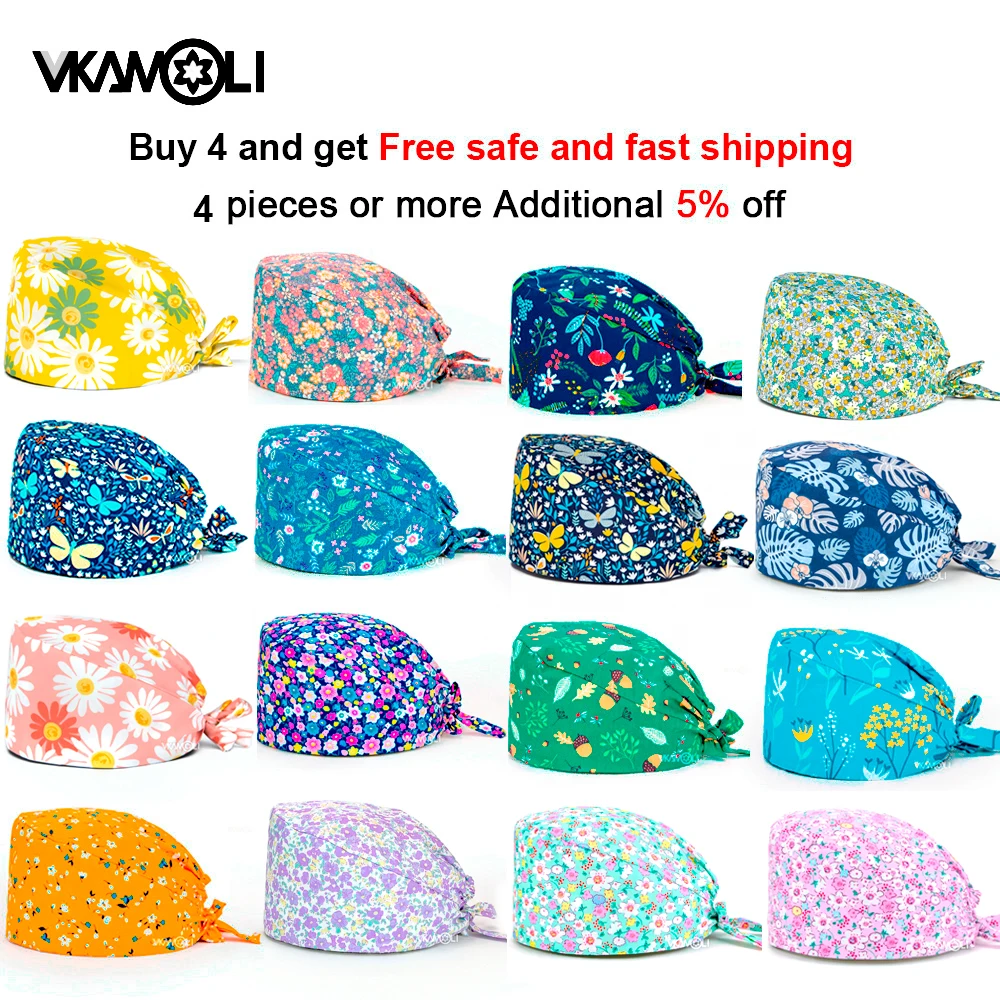 women's Cotton scrubs caps weat-absorbent Elastic Section pet grooming nursing work hats lab Flower print scrub hat Wholesale  Read more