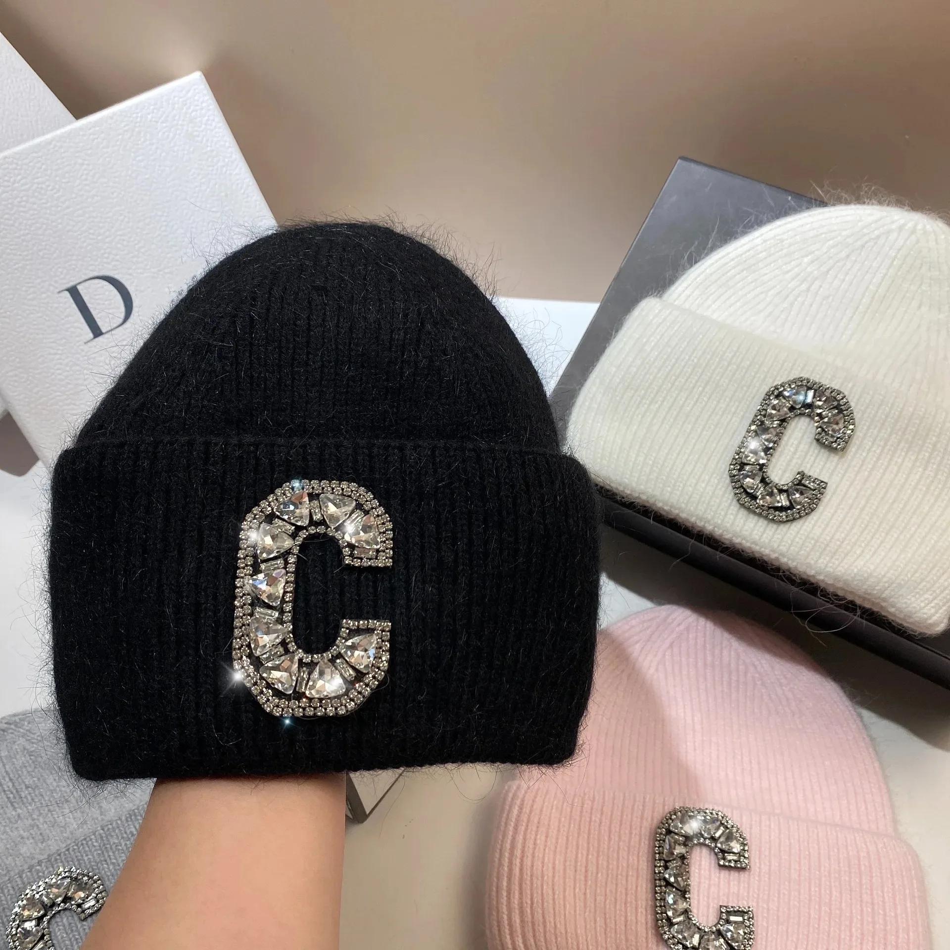 Luxury Rhinestone Letter C Knitted Hat Real Rabbit Fur Women Men Winter Warm Beanie Ear Protection Sking Skullies Beanies Cap