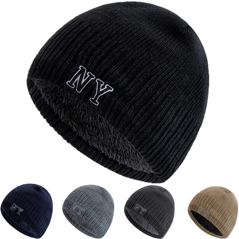 New Style Unisex Autumn/Winter Hats Plush Fur Lined Men Women Warm Beanie Cap Casual NY Printing Winter Ski Knitted Hats